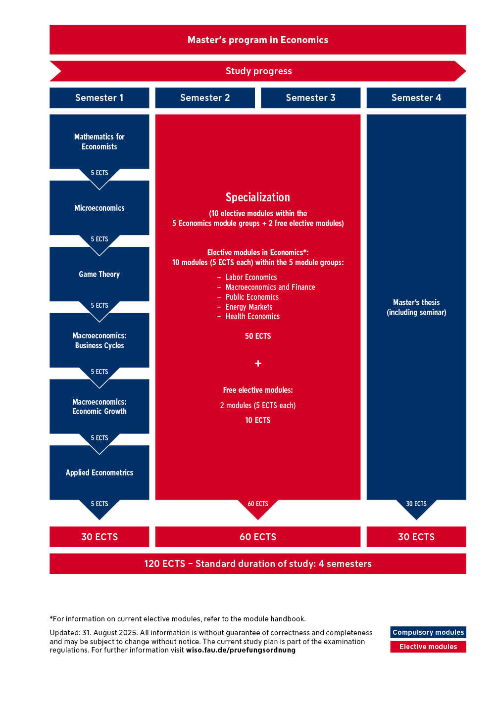 - First semester: six compulsory courses, covering the basic fields of economics (Mathematics for Economists, Applied Econometrics, Microeconomics, Game Theory, Macroeconomics: Economic Theory, and Macroeconomics: Business Cycles)